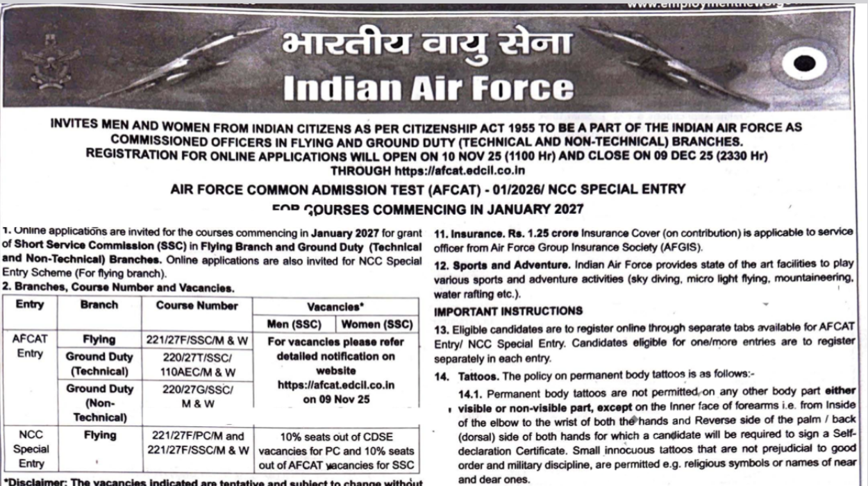 AFCAT 01/2026 Batch Recruitment 2025 : Eligibility Criteria
