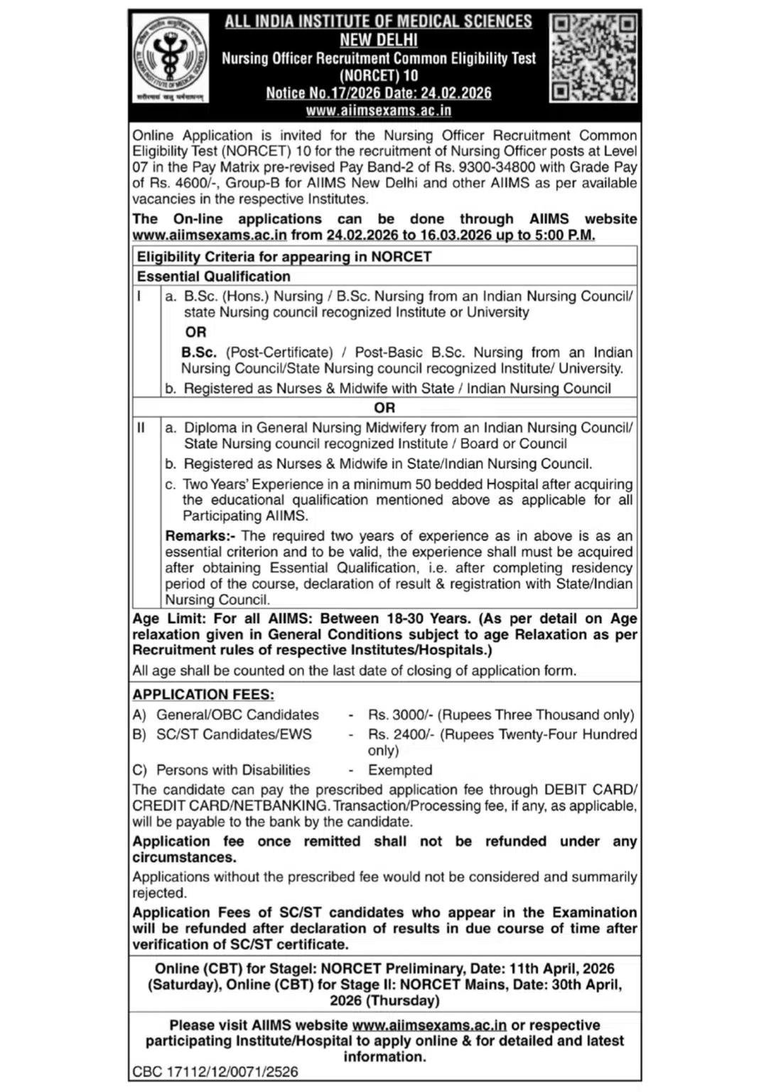 AIIMS NORCET 10th Nursing Officer Recruitment 2026