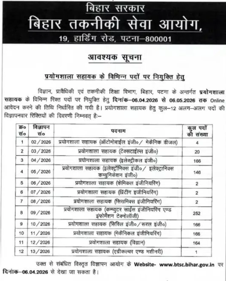Bihar Technical Service Commission (BTSC) has announced the BTSC Laboratory Assistant Recruitment 2026 with a total of 1091 vacancies. Among these, positions such as Laboratory Assistant in Medical, Chemical, and Physics departments are available. Currently, the application process is open for the year 2026.