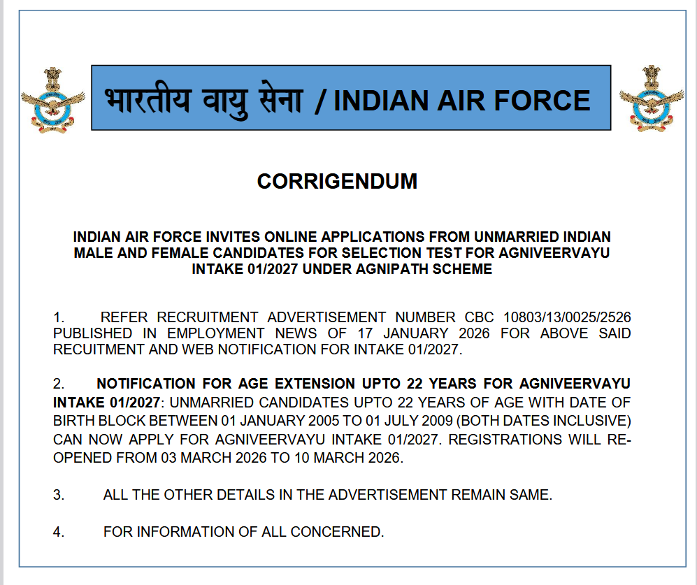 | Indian Airforce Agniveer Vayu Intake 01/2027 |