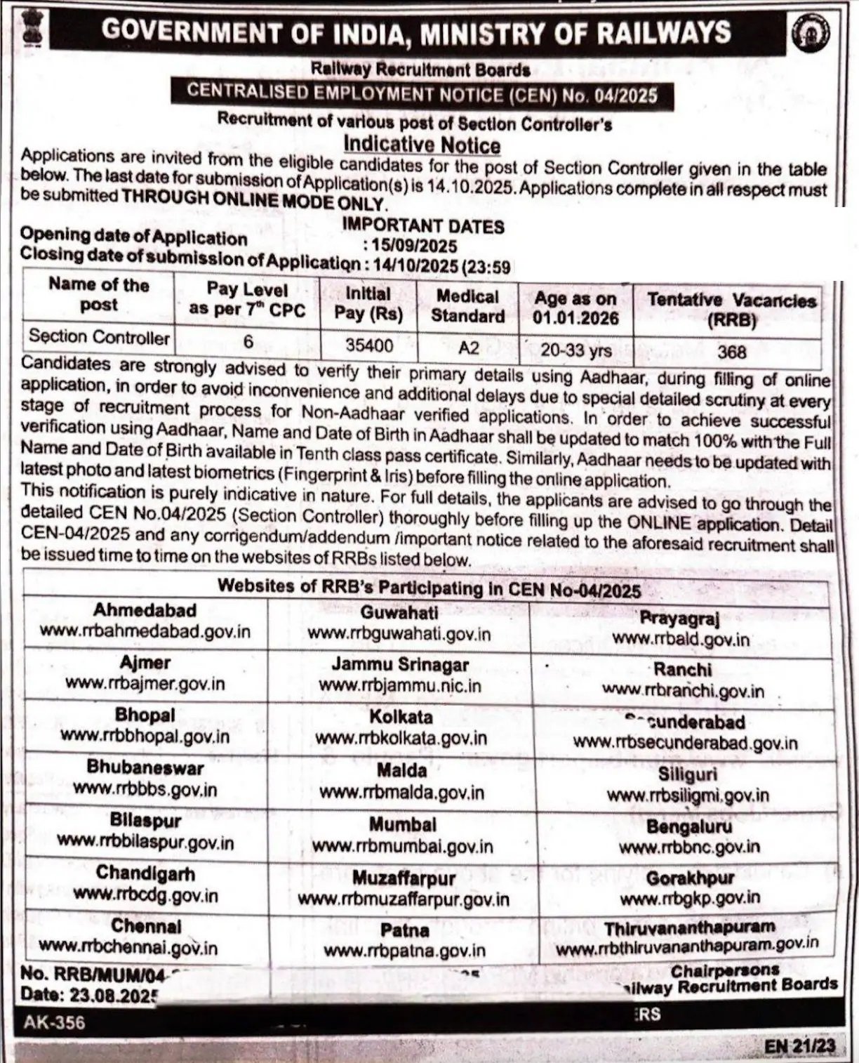 Railway RRB Section Controller 2025 : Category Wise Vacancy Details